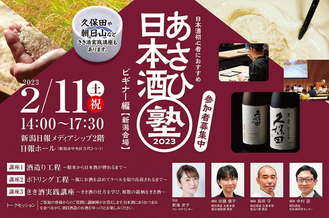 朝日酒造株式会社(本社:新潟県長岡市、取締役社長:細田 康)は、20歳以上の日本酒ビギナーを対象とした日本酒セミナー「あさひ日本酒塾 ビギナー編」を、2023年2月11日(土・祝)に、新潟日報メディアシップ(新潟市中央区)で開催いたします。