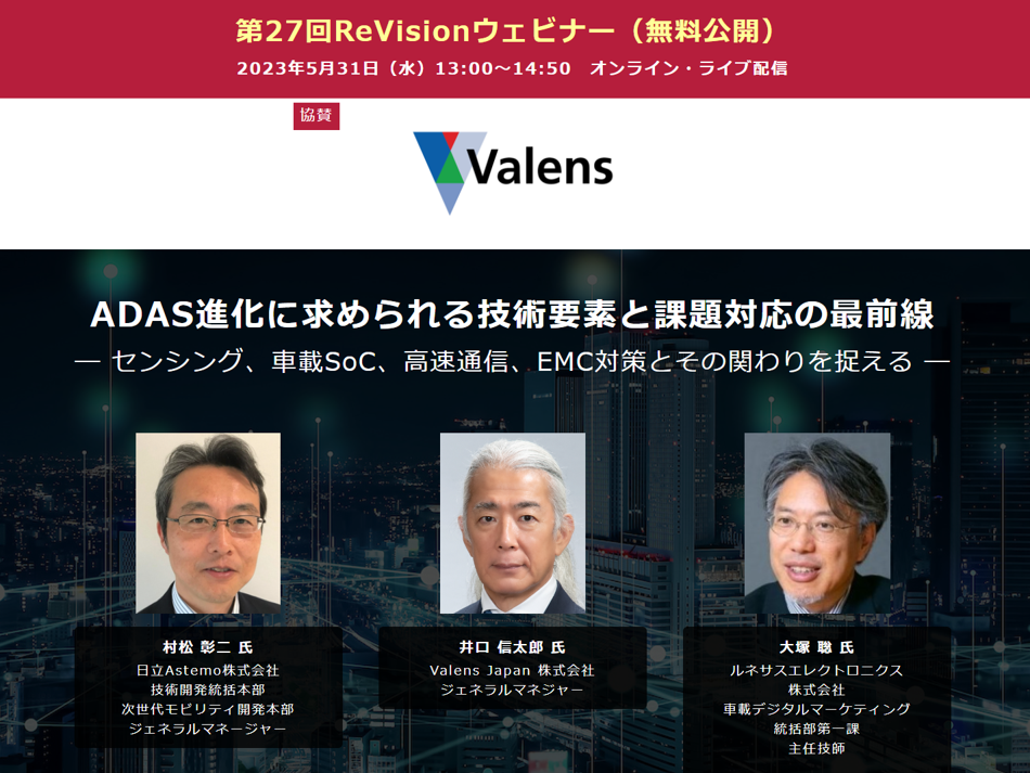 【無料WEBセミナー】 日立Astemo・ルネサスエレクトロニクス・Valensから講師を迎え、「ADAS進化に求められる技術要素の最前線」について無料ライブ配信 ― 5月31日(水)