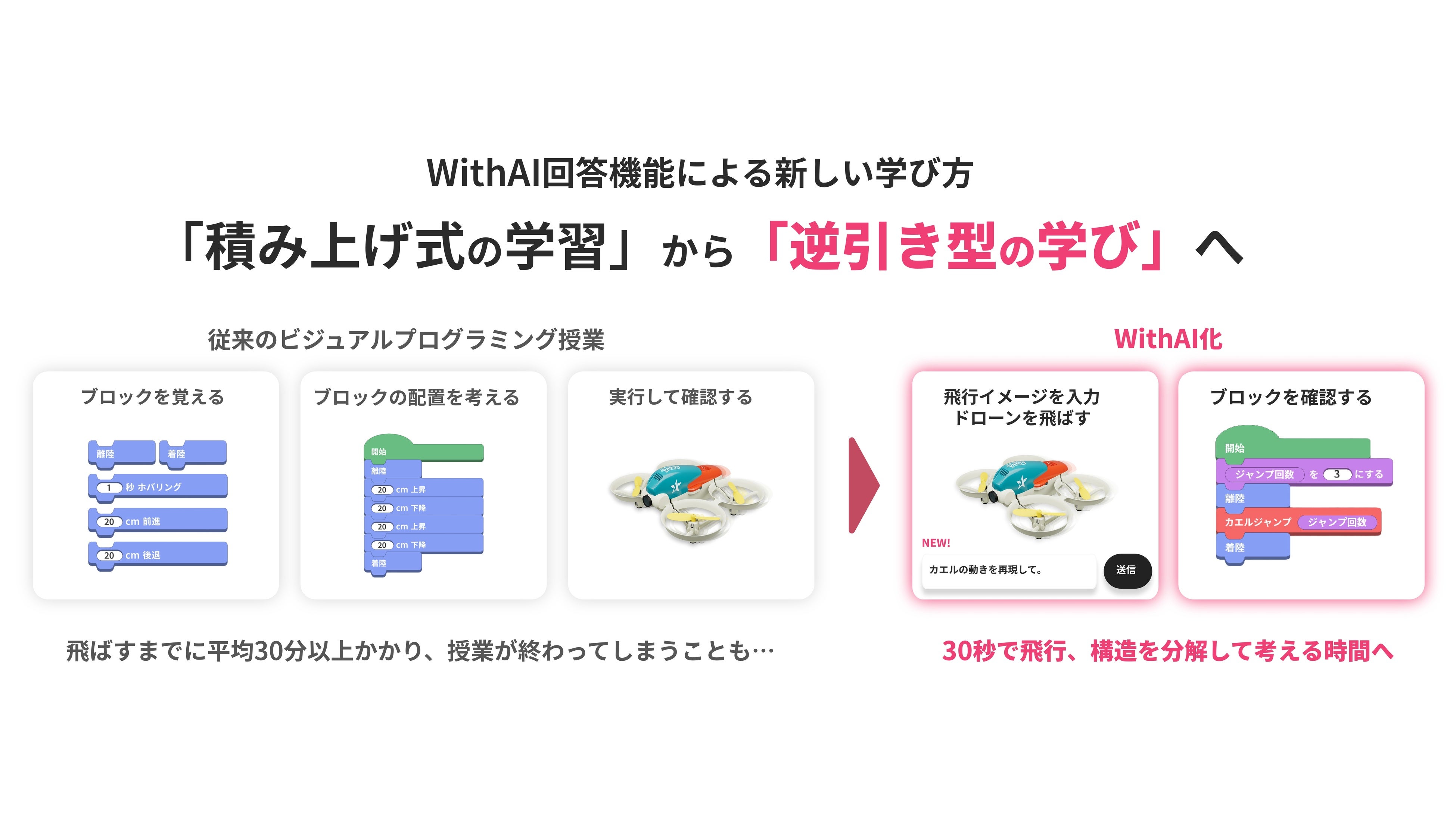 これにより、従来のようにブロックの意味を理解して配置し飛ばす「積み上げ式の学習」から、AIの回答例をもとに構造を理解する「逆引き型の学び」へと変化。