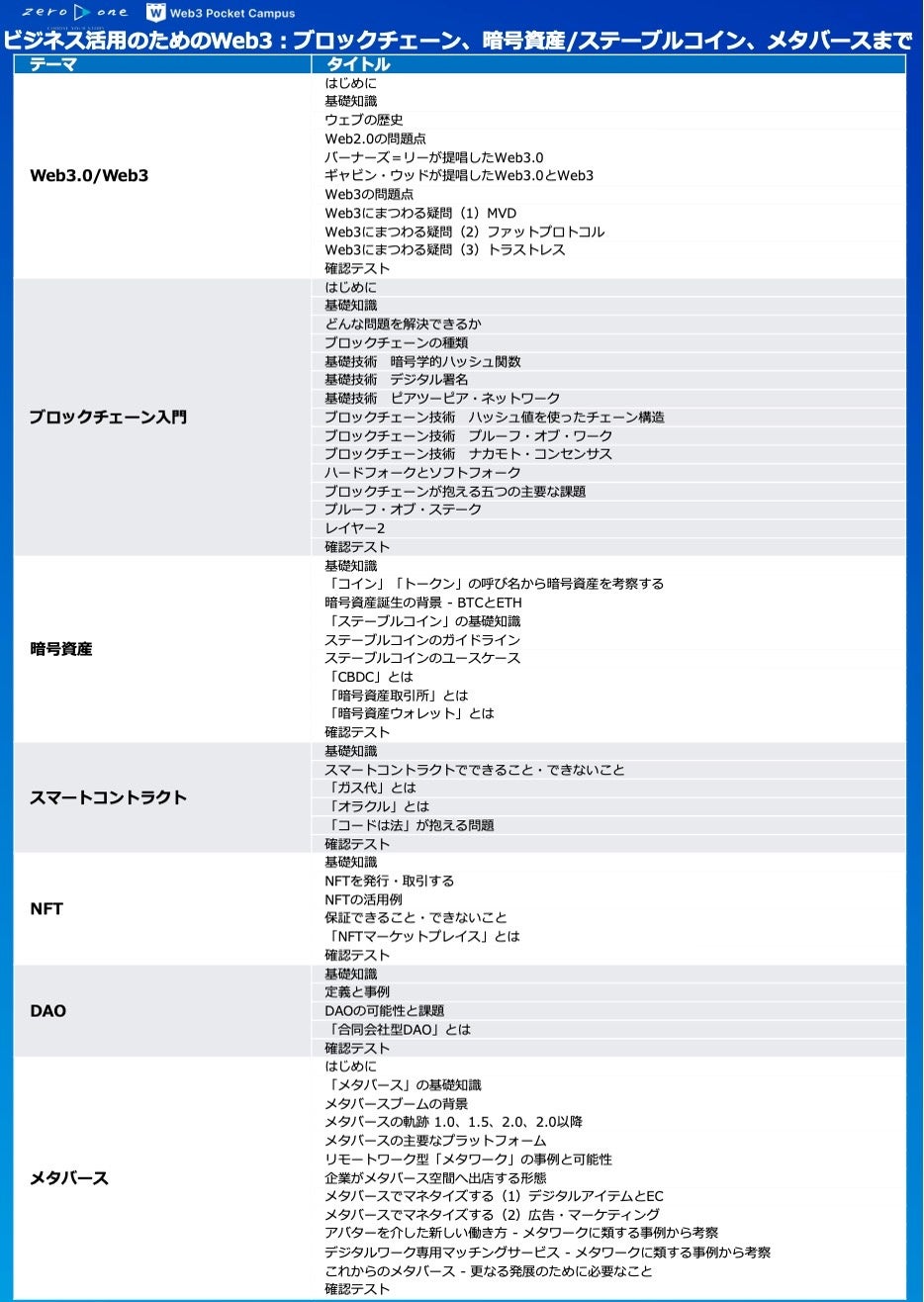 株式会社zero to one(本社:宮城県仙台市、取締役CEO:竹川 隆司、以下「zero to one」)は、野村證券株式会社(以下「野村證券」)と共同開発したオンライン教材「ビジネス活用のためのWeb3:ブロックチェーン、暗号資産/ステーブルコイン、メタバースまで」(以下「本コース」)において、最新の暗号資産・ステーブルコインおよびNFT領域の動向を踏まえ、コンテンツのアップデートを実施いたしました。アップデート後の本コースは、12月8日よりオンライン(クレジットカード決済)、法人契約(個別にお問い合わせください)双方にて、提供を開始いたします。