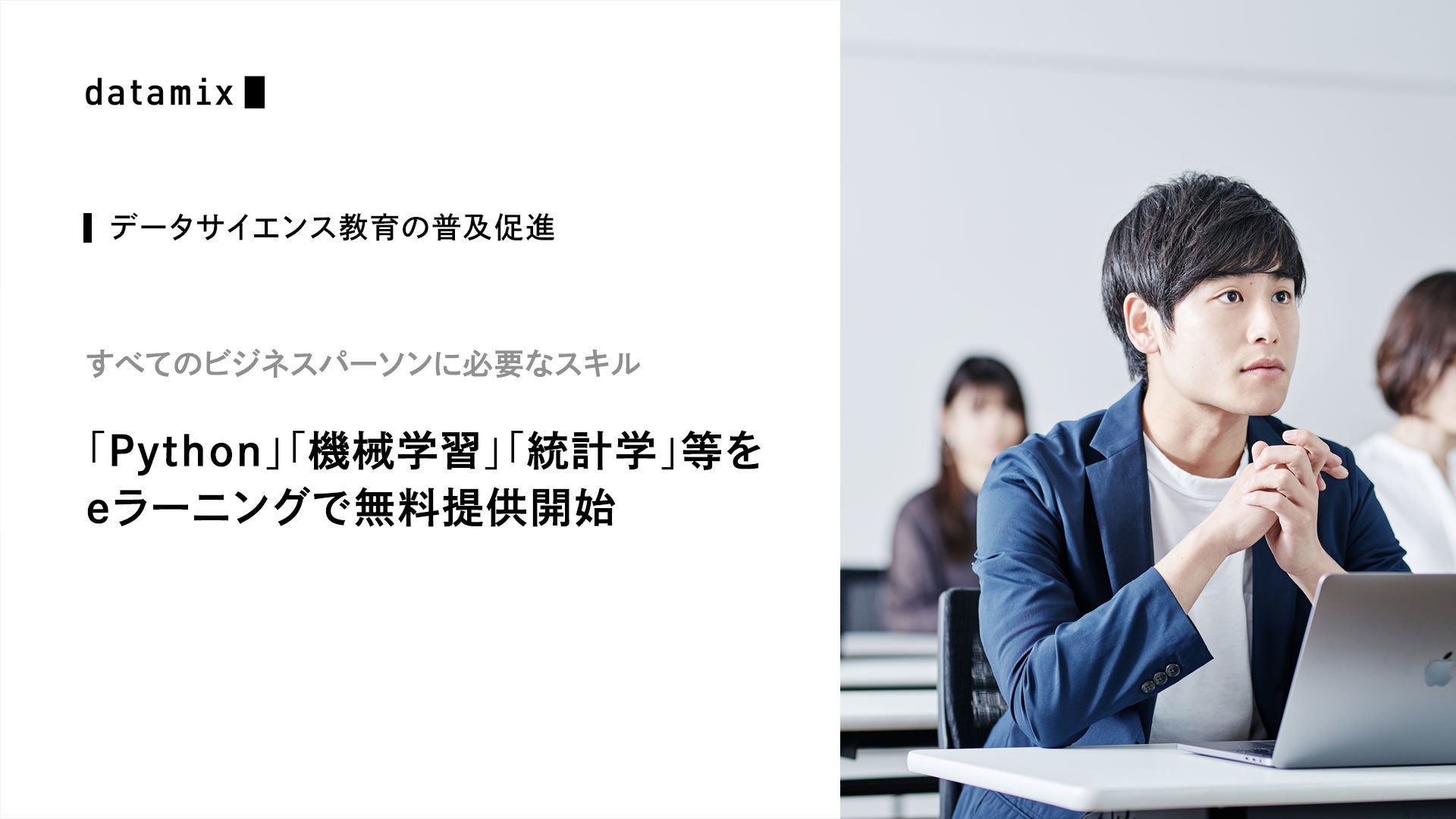 株式会社データミックス(本社:東京都千代田区、代表取締役:堅田 洋資、以下、データミックス)は、データサイエンスに求められるPython、機械学習、ビジネス統計、デジタルマーケティングのスキル別講座(eラーニング)を無料提供します。データミックスは、大学・専門学校向けのデータサイエンス教材の無償配布をはじめ、データサイエンスに求められるスキルの初学者向け講座の無料提供を通して、データサイエンス教育のさらなる普及を促進するための活動を展開していきます。