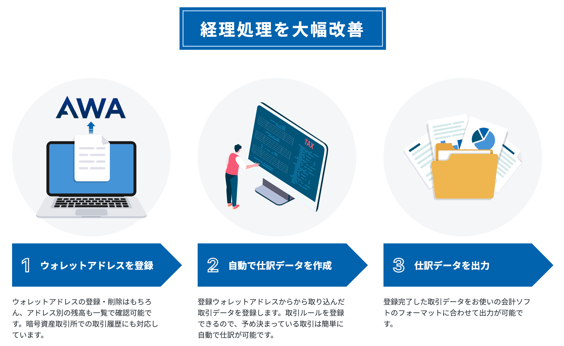 Web3ビジネスの経理サポートツール「Aerial Web3 Accounting(AWA)」では、デジタルアセット取引の原価・損益計算に加え、暗号資産を取り扱う事業者特有の経理業務をサポートする機能が内包されています。また、ウォレットアドレスの管理から仕訳データの作成までを自動で行う機能により、ブロックチェーンの仕組みが分からない方でも簡単にご利用いただくことが可能です。