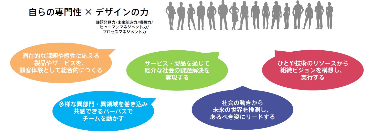 「DXD人材」をめざす人に必要なマインドセットからデザイン思考、実装のためのマネジメント法まで、全方位的に学無ことができます。