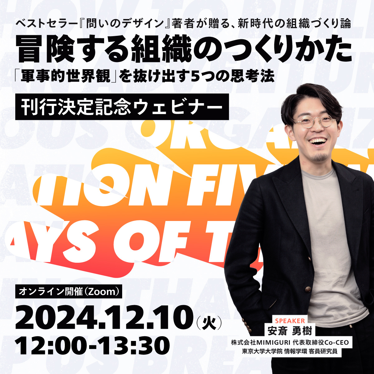 本ウェビナーでは、安斎本人が登壇し、発売前の新著『冒険する組織のつくりかた』の一部を特別に公開、同書を読むのが120%楽しくなる「冒険のヒント」を満載にして参加者の皆さまにお届けします。2023年6月に開催され、登録者3,000人を突破、参加者満足度98.6%を記録し、企業の経営・マネジメント層から好評を博したMIMIGURI主催ウェビナー「人と組織に強い経営人材になるための『新時代の組織づくり』」からさらに進化・パワーアップした、安斎が提唱する最新の"組織づくり論"にご期待ください。