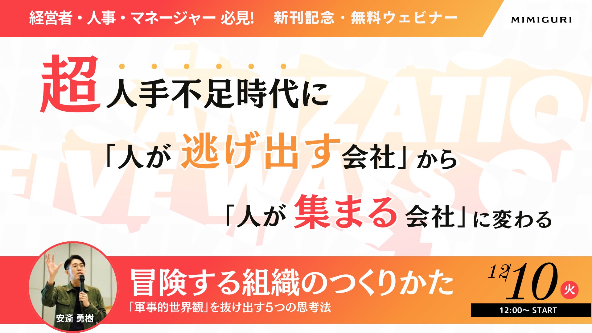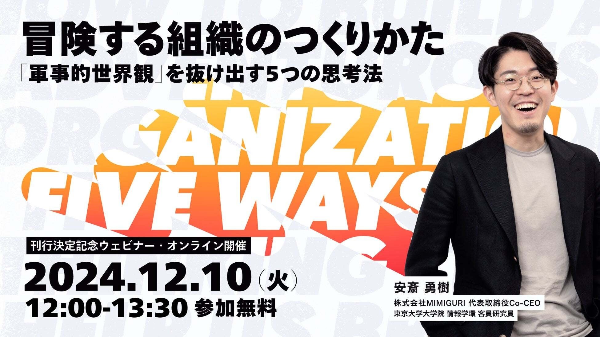 株式会社MIMIGURI(本社:東京都文京区、Co-CEO:ミナベトモミ、安斎勇樹、以下「MIMIGURI」)は、代表取締役Co-CEOの安斎勇樹による新著『冒険する組織のつくりかた 「軍事的世界観」を抜け出す5つの思考法』の刊行決定を記念し、2024年12月10日(火)12:00より、安斎本人が登壇する無料ウェビナーを開催いたします。