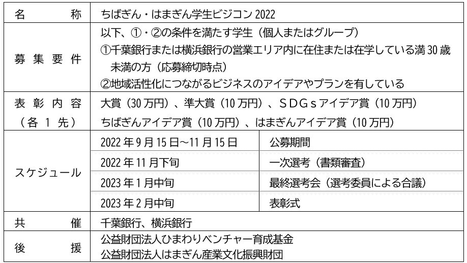 千葉銀行(頭取 米本 努)は、コンコルディア・フィナンシャルグループの横浜銀行(頭取 片岡 達也)との業務提携「千葉・横浜パートナーシップ」 に基づく連携施策として、2022年9月15日(木)より、横浜銀行と「ちばぎん・はまぎん学生ビジコン2022」を共催します。