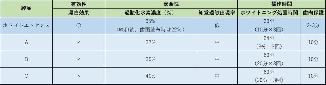 ホワイトエッセンスが開発・販売を手掛ける「ホワイトエッセンスホワイトニングプロ」は、2018年12月に薬事承認された薬材で、最新の国内承認品に該当し、オフィスホワイトニングで使用する薬材において、年間出荷実績70%以上のシェアを占めるというデータもあります。※3