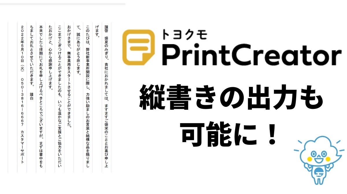 トヨクモ株式会社(本社:東京都品川区、代表取締役社長:山本 裕次、以下トヨクモ)は、サイボウズ株式会社(本社:東京都中央区、社長:青野 慶久、以下サイボウズ)が提供する業務改善プラットフォーム「kintone」と連携するkintone連携サービス「プリントクリエイター」にて、縦書きでの出力に対応したことをお知らせいたします。