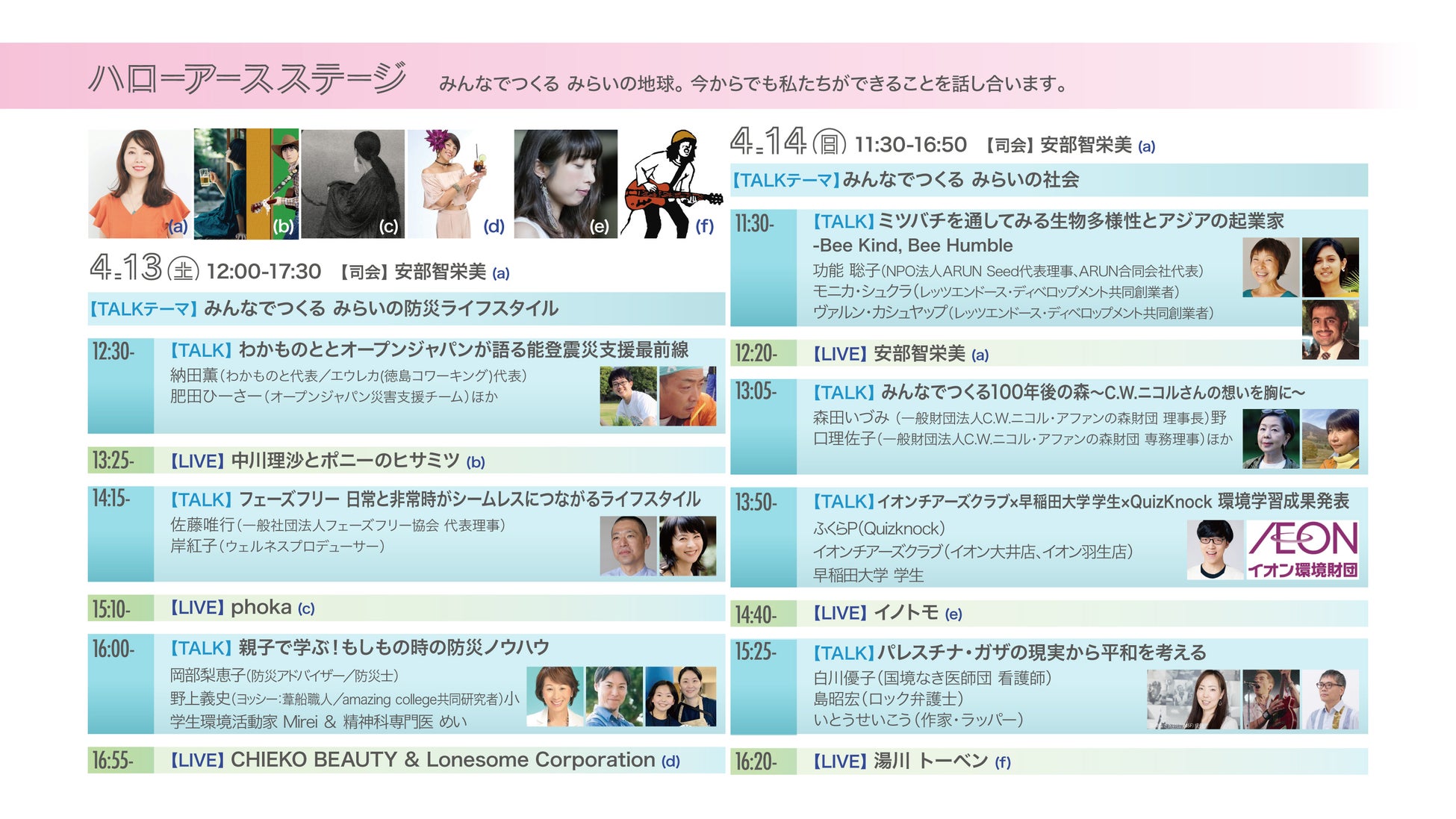 Kruhiファウンダー・俳優の井浦新さん、女優・タレントの篠田麻里子さん、自由人高橋歩さんなど豪華ゲストをお招きしたトークセッション、人気youtuber「QuizKnock」のふくらP(supported byイオン環境財団)のクイズなど、バラエティに富んだメンバーでアースデイ・コンサートを開催します。また、「みんなでつくるみらいの地球」をテーマに、防災、紛争、環境、森づくり、社会起業家、フェーズフリーなどのトークを軸にしたハローアースステージも。