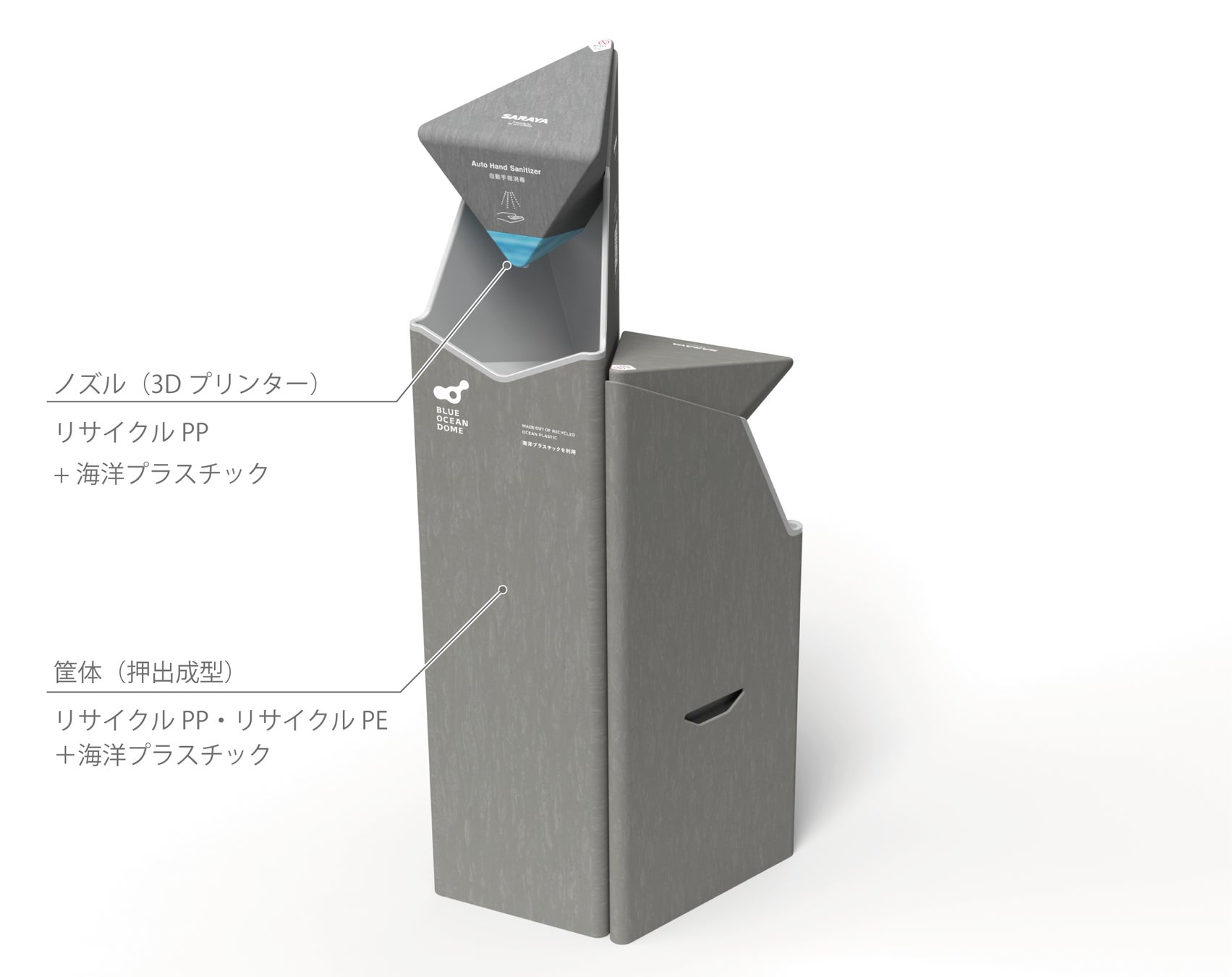 近年、海洋の環境問題は深刻さを増しており、海洋プラスチックごみの海洋生物や生態系への影響なども大きな問題となっています。すでに1億5,000万トン※1の海洋プラスチックごみがあり、さらに毎年1,200万トン※2もの量が海へ流れ込んでいると言われています。3DPCはこれまでに、リサイクル素材を活用したプロジェクトに取り組み、環境問題への取り組みを進めてきました。今回の製作では、ディスペンサーの青いノズル部分を、再生PPと海洋プラスチックを配合した原料で製造しました。