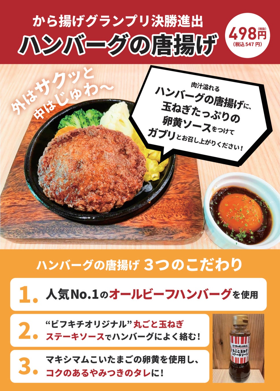 - ②から揚げグランプリ金賞受賞!ハンバーグのから揚げをSNSに投稿してくれるとビフテキサービス(ビーフキッチンスタンド全店舗)