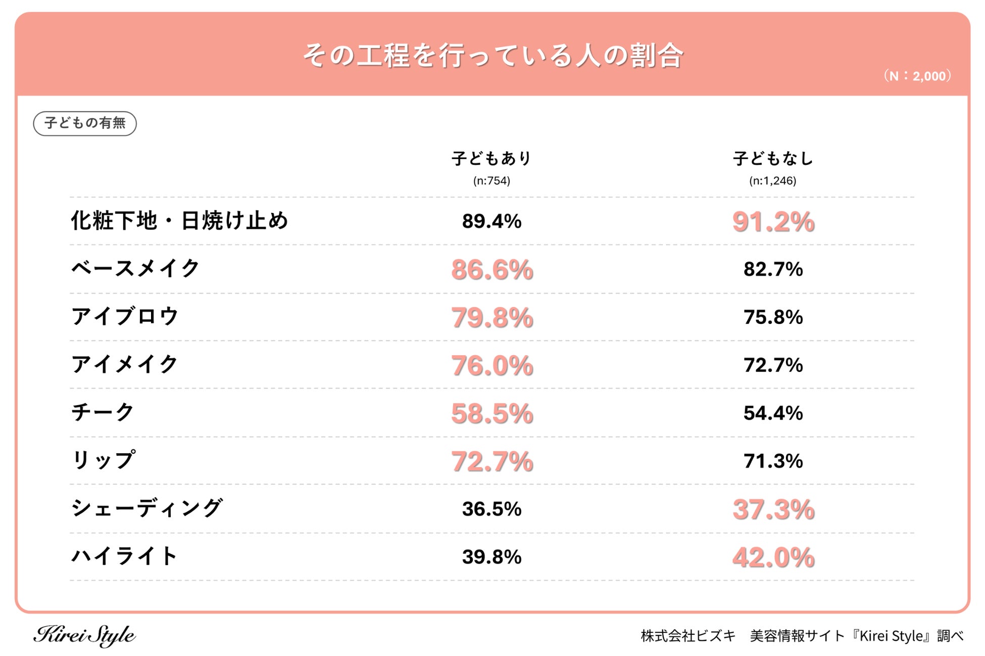 子どもの有無で見ると、各項目の回答率に大差はありませんでしたが、「子どもあり」が多くの項目で上回る結果になりました。一方、シェーディング、ハイライトなど、細かい工程は「子どもなし」が上回っています。子どもの有無によって外出機会や出向く場所が異なり、メイクの優先度が変化していることが伺えました。