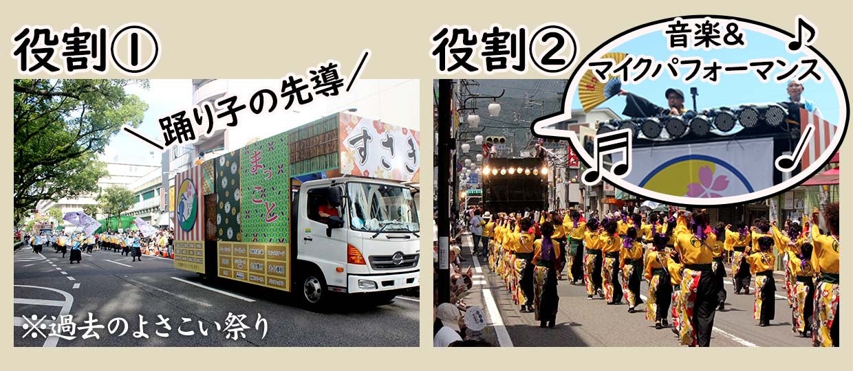 今回虎斑竹を使用して製作する地方車には、踊り子を先導したり荷台から音楽を流してマイクパフォーマンスをする役割があり、よさこい祭りには欠かせない存在です。