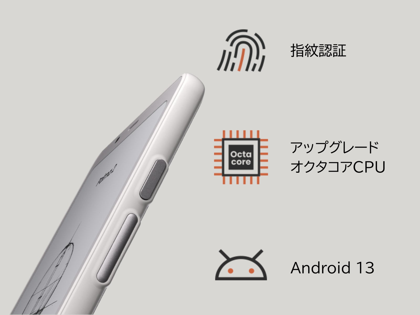 BOOX Palma2は電源ボタンの部分に指紋認証機能を搭載しているので簡単なタッチ操作でロックを解除。これによりセキュリティと利便性を両立できるようになりました。CPUはアップグレードされた8コアを採用したことにより動作速度が向上しています。AndroidのバージョンはAndroid11からAndroid13へと2段階の進化を遂げました。電子書籍アプリのアップグレードにも対応可能です。