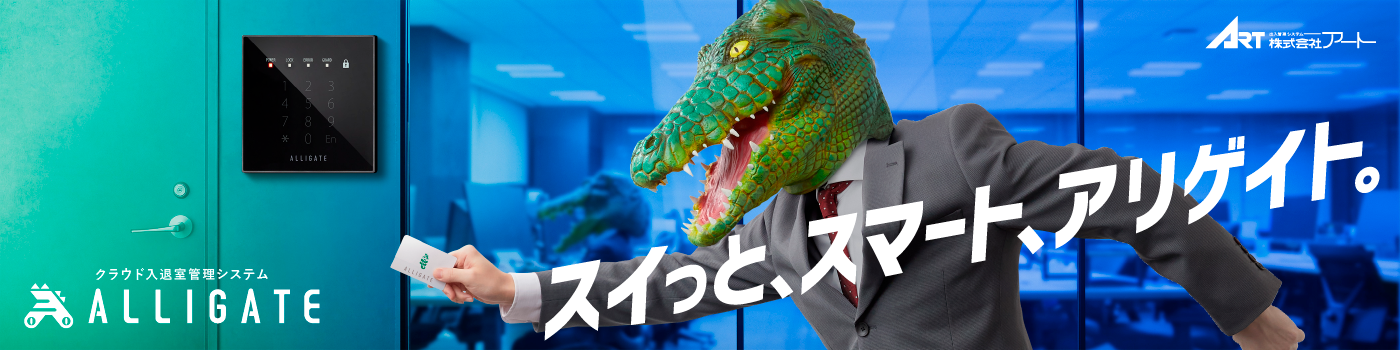ALLIGATE(アリゲイト)は、カギの発行・無効化、入退室履歴の確認など入退室管理に必要な機能を備えた、月額制のクラウド型の入退室管理システムです。ICカードやスマートフォンが物理鍵の代替となり、Web管理ツール(Webブラウザ)でいつでもどこでもカギの発行や無効化ができます。複数拠点の一元管理のほか、オフィスやビジネスに不可欠な利便性の高い機能を豊富に揃えています。また、機器の取り付けや導入後の現地での保守サポートにも対応しています。
