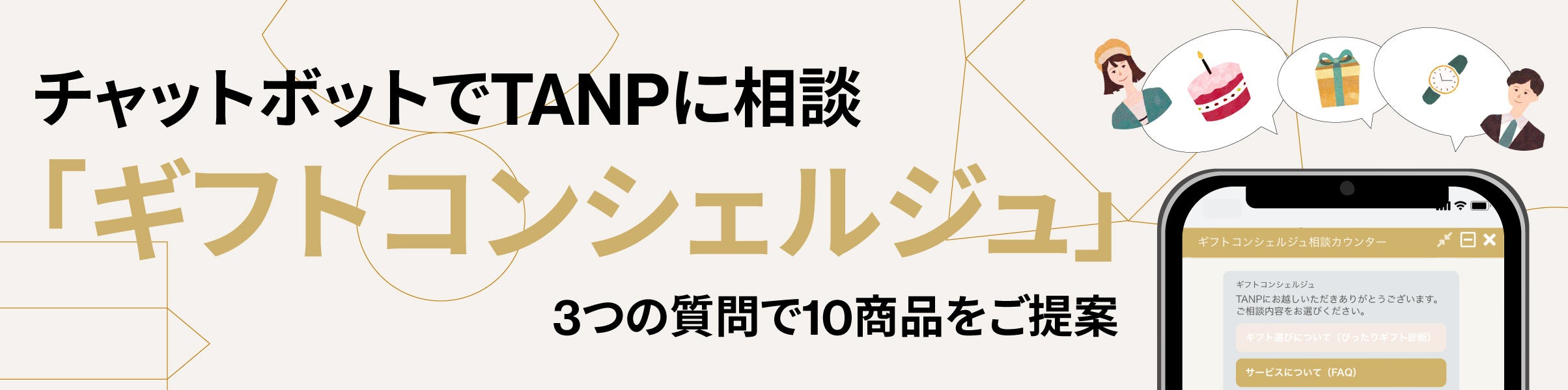 TANPの「ギフトコンシェルジュ」機能は、3つの質問に回答するだけで、約15,000(※)の取扱商品から、お客様のご要望に沿った10商品のギフトをご提案するチャットボット機能です。通常の検索とは別の角度からギフトを探したいお客様だけでなく、お急ぎのお客様にもおすすめな機能です。(※2022年8月初旬時点、公開商品のみ。SKU数とは異なります。)