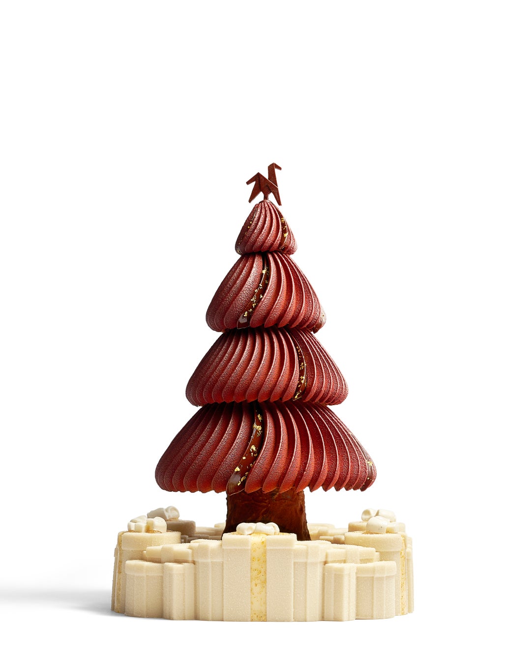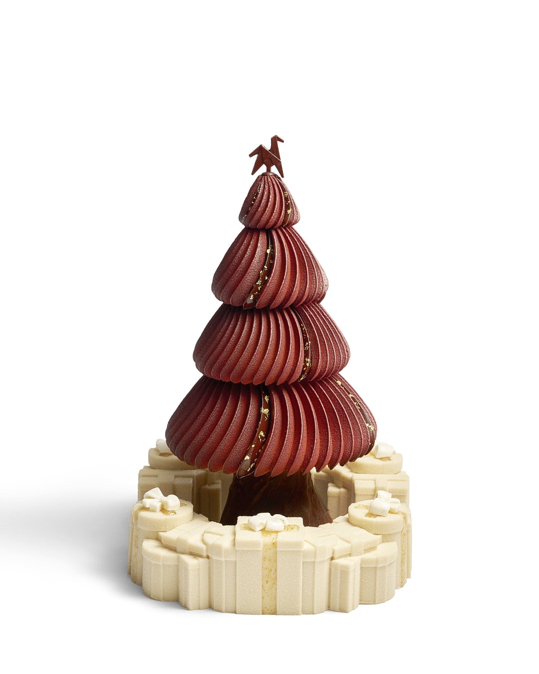 祝祭の季節に寄せて、シェヴァル・ブラン パリのペイストリー・シェフ、マキシム・フレデリック氏とブーランジュリー・チームは、クリスマスの情景そのものをひとつの彫刻的デセールとして結晶させました。渦を描くように立ち上がるクリスマスツリー。その根元を、繊細に配置された白いギフトボックスが輪をなして取り囲みます。