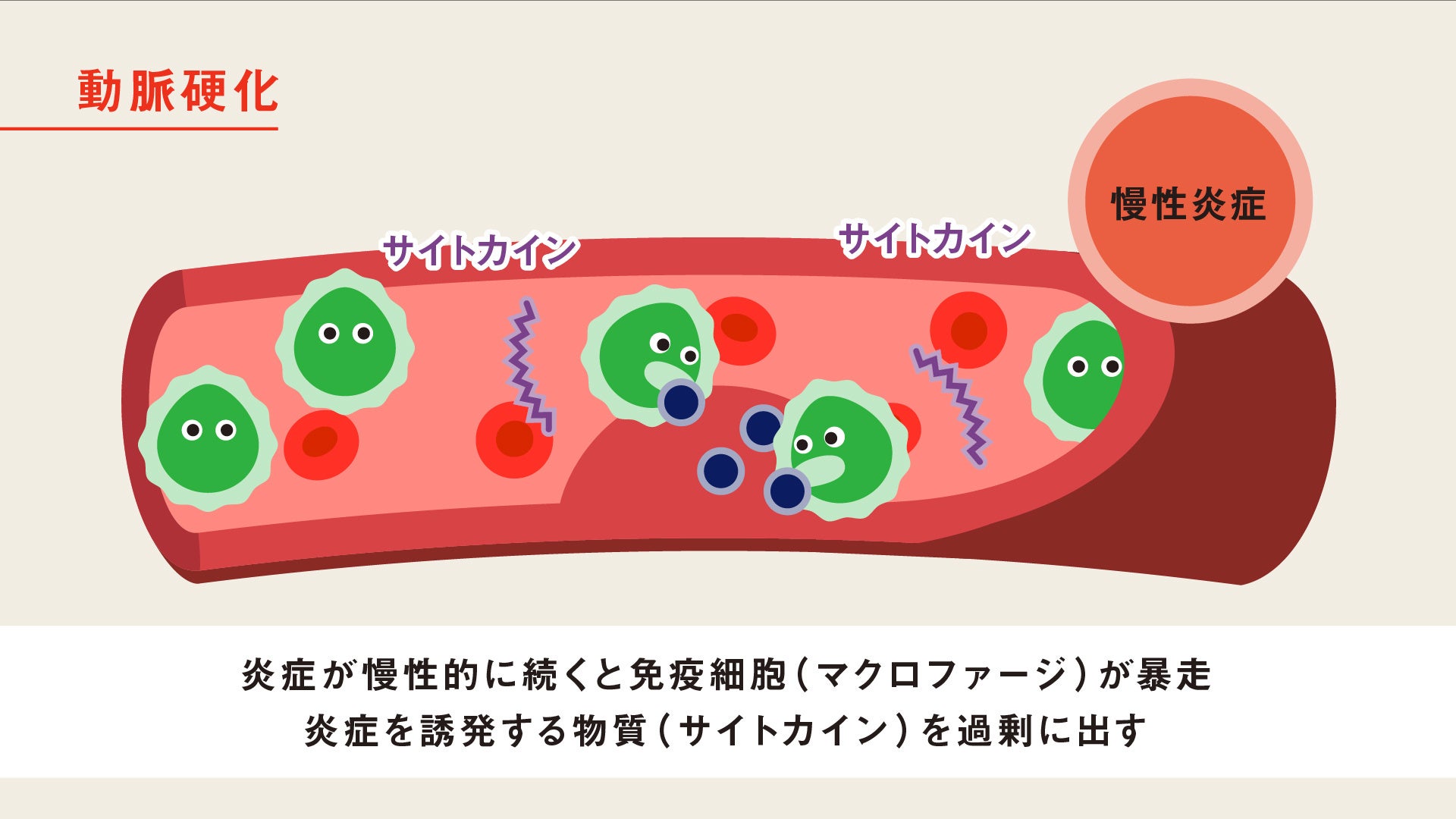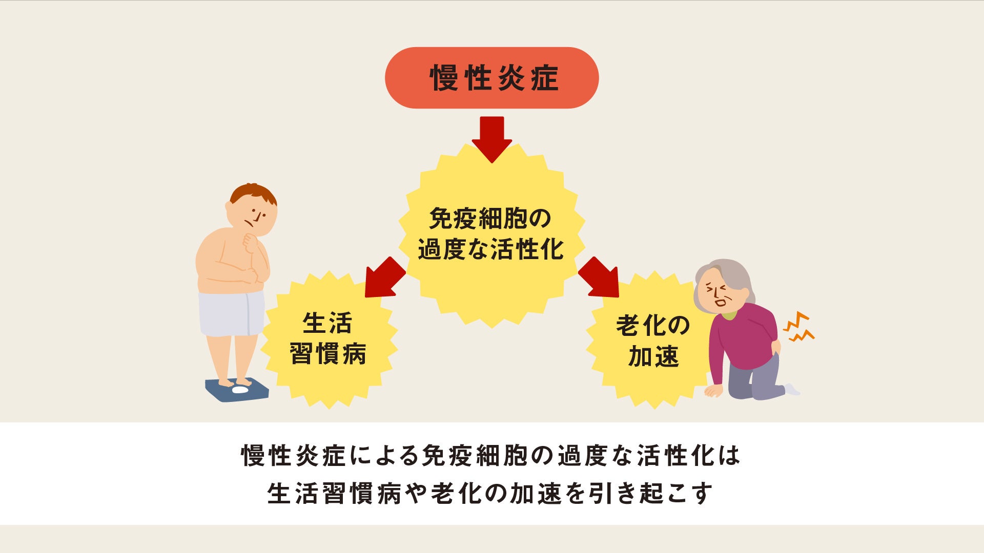 急性炎症は熱が出たり、赤く発疹が出たりと分かりやすく、治癒したことも自覚しやすい。一方で、慢性炎症は目に見えず、自覚症状もないため、時間がたってから“疾病”という形で出てくる。日ごろから慢性炎症になりにくい生活習慣を身に付けることが重要。様々な疾病の根底にあるものは「炎症」であるため、「慢性炎症」を抑えることが、疾病になることを防ぐと考えている。カテキンなどを摂取するということも、その一つの手段となる。