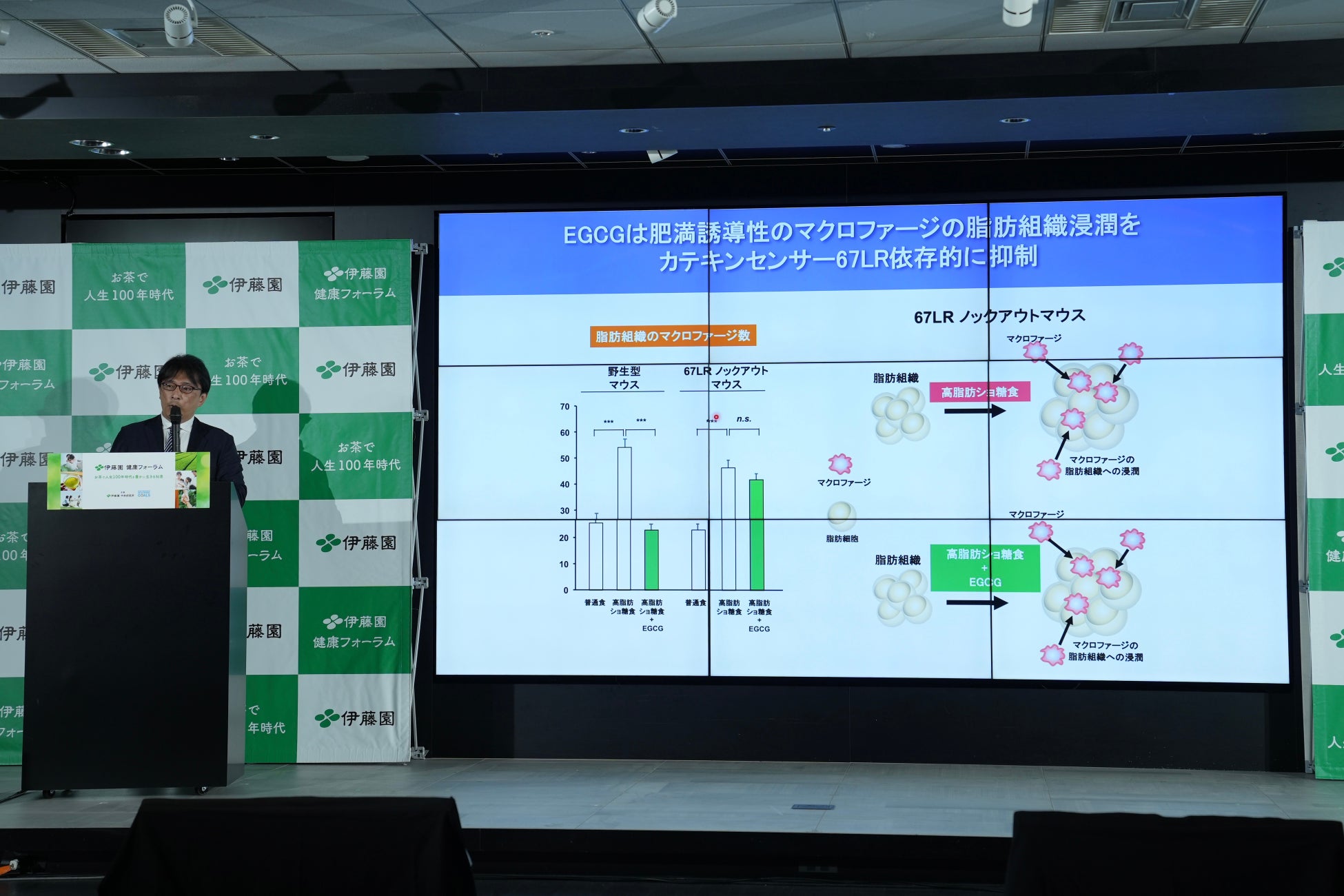 お茶が健康に良いということは古くから知られていた。近年になり、EGCGの「抗がん作用」「抗肥満作用」などの様々な健康効果が明らかになっている。食品による健康の維持増進には、まず、食品成分を細胞が感知するということが非常に重要。生体が緑茶カテキン(EGCG)を感知するしくみとしては、67LRという分子が受容体としてEGCGを感知する。67LRがある場合のみに、EGCGによる抗がん作用が認められている。すなわち、EGCGの効果を発揮するためには67LRが非常に重要である。