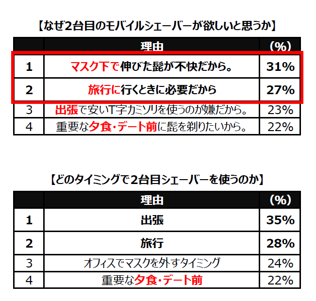 また、当社の消費者調査※2では、約半数以上の男性が、朝ヒゲを剃ったのに夕方には「ヒゲが伸びてきた」と感じたことがあるということが判明し、多くの男性が夕方ヒゲに悩んでいることが分かっています。また、最新の調査※3によると、コロナ禍でも持ち運びをし易い2台目シェーバーを購入したいと考える方は25歳から39歳の男性で最も多く、約4割以上(44%)いることが判明。その主な理由としては、「マスク下で伸びたヒゲが不快だから」(31%)、「旅行に行くときに必要だから」(27%)、「出張で安いT字カミソリを使うのが嫌だから」(23%)、「重要な夕食・デート前にヒゲを剃りたいから」(22%)が挙げられ、使用タイミングとしては「出張」(35%)、「旅行」(28%)、「オフィスでマスクを外すタイミング」(24%)、「重要な夕食・デート前」(22%)と、ビジネスや旅行、ナイトタイムといったシチュエーションで特にしっかりと「ヒゲ」を剃りたいと考えている男性が多くいることが明らかとなりました。