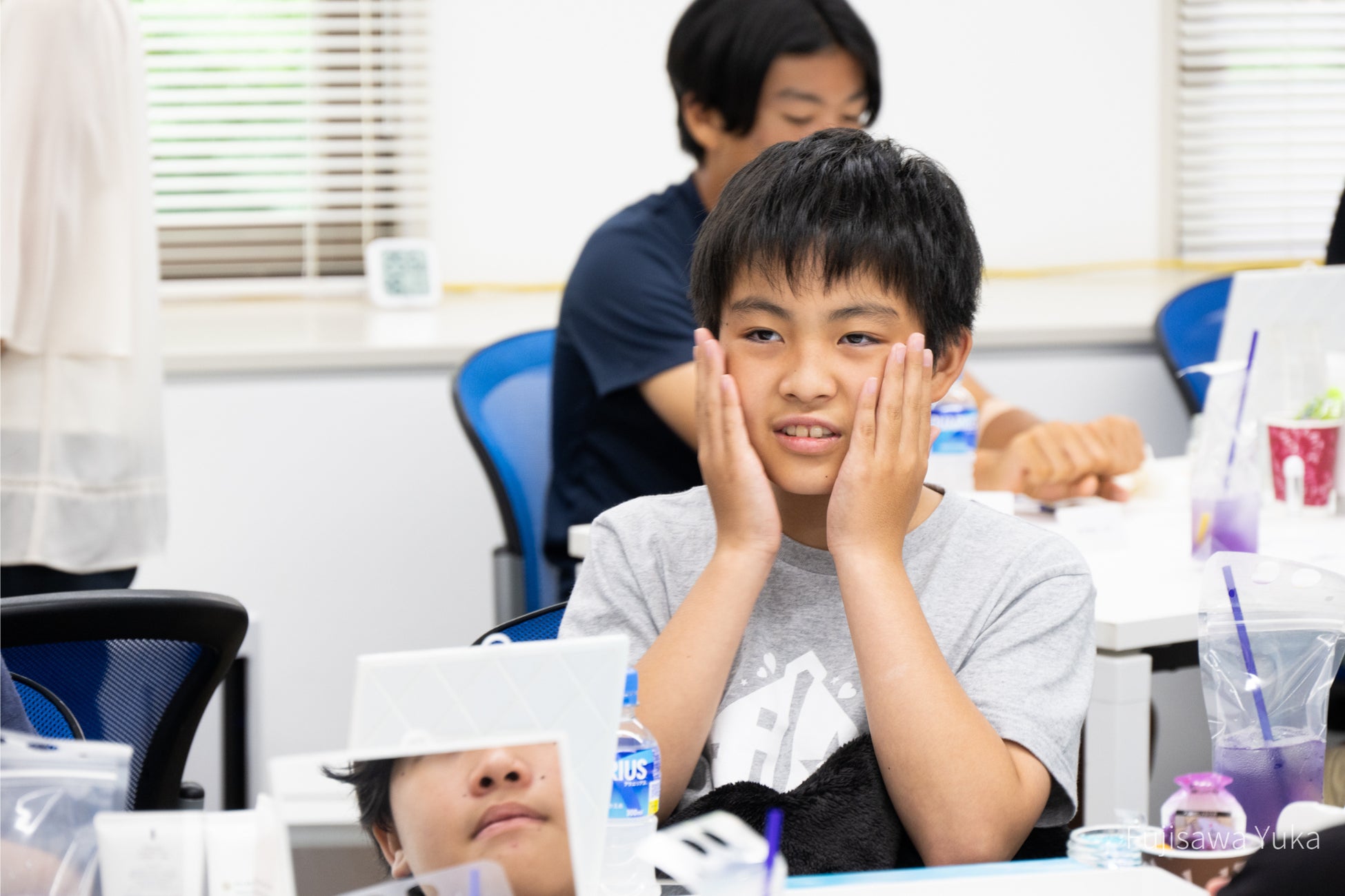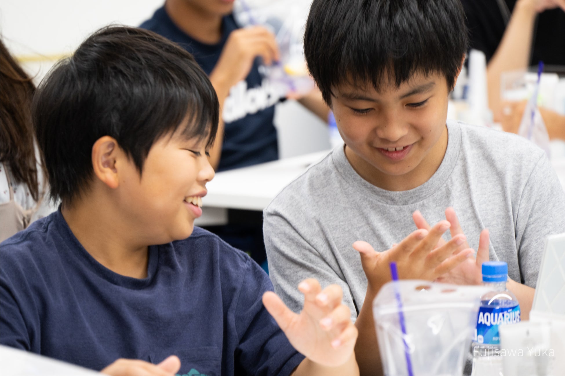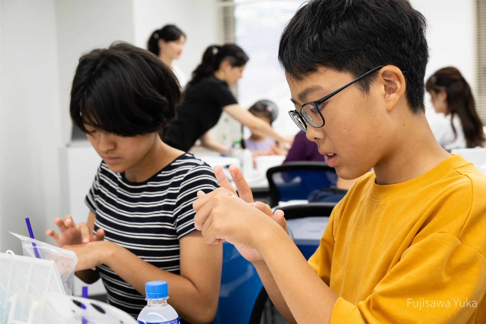 洗顔料に入っているこんにゃくスクラブのやわらかいつぶつぶ感や、⼝紅がするすると落ちていく様子に、⼩学⽣の⽅々は興味津々で、 実験のように楽しんでいました。