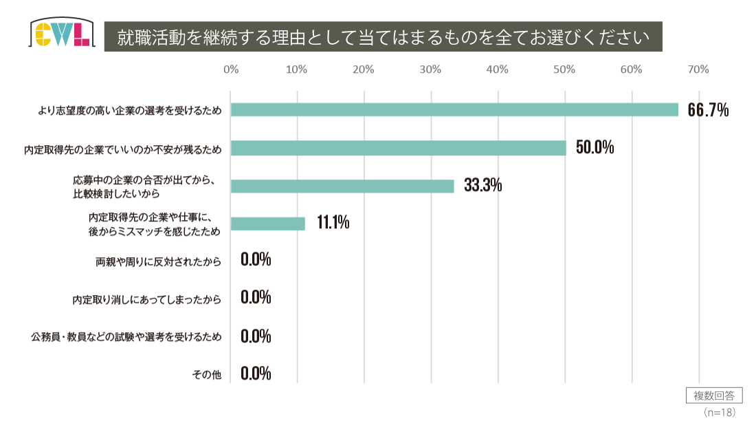 - 内定取得後も継続する理由は、コロナ禍での不安から起因している可能性が潜在的にある