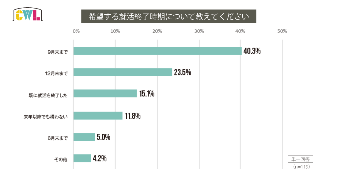 アンケートで聞いてみたところ、『9月末まで』が40.3%、年内までを想定している学生は23.5%となり、63.8%の学生がなるべく早い段階での年内までに就職活動を終えたいと考えているようです。