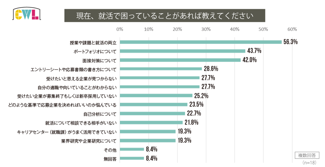 美術系学生に就職活動で困っていることについて意識調査したところ、以下のように多くの悩みを抱えていることがわかります。