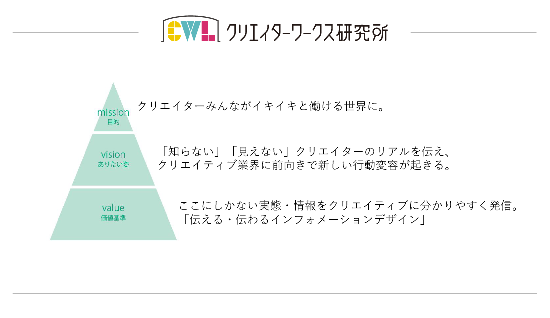 クリエイターワークス研究所(CWL)は『クリエイターみんながイキイキと働ける世界に』をミッションに、クリエイティブ業界に特化した実態調査を⾏っている調査機関です。