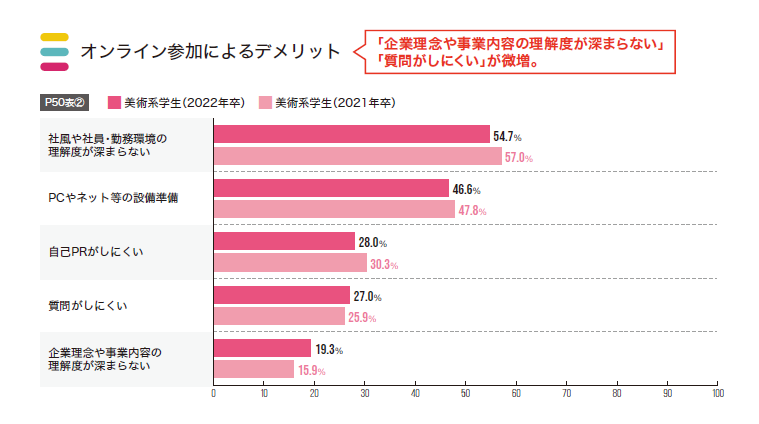 この調査では、コロナ禍2年、美術系学生の就職活動の実態はどのように変化してきているのか?など、より詳しい実態について、以下よりご覧になれます。