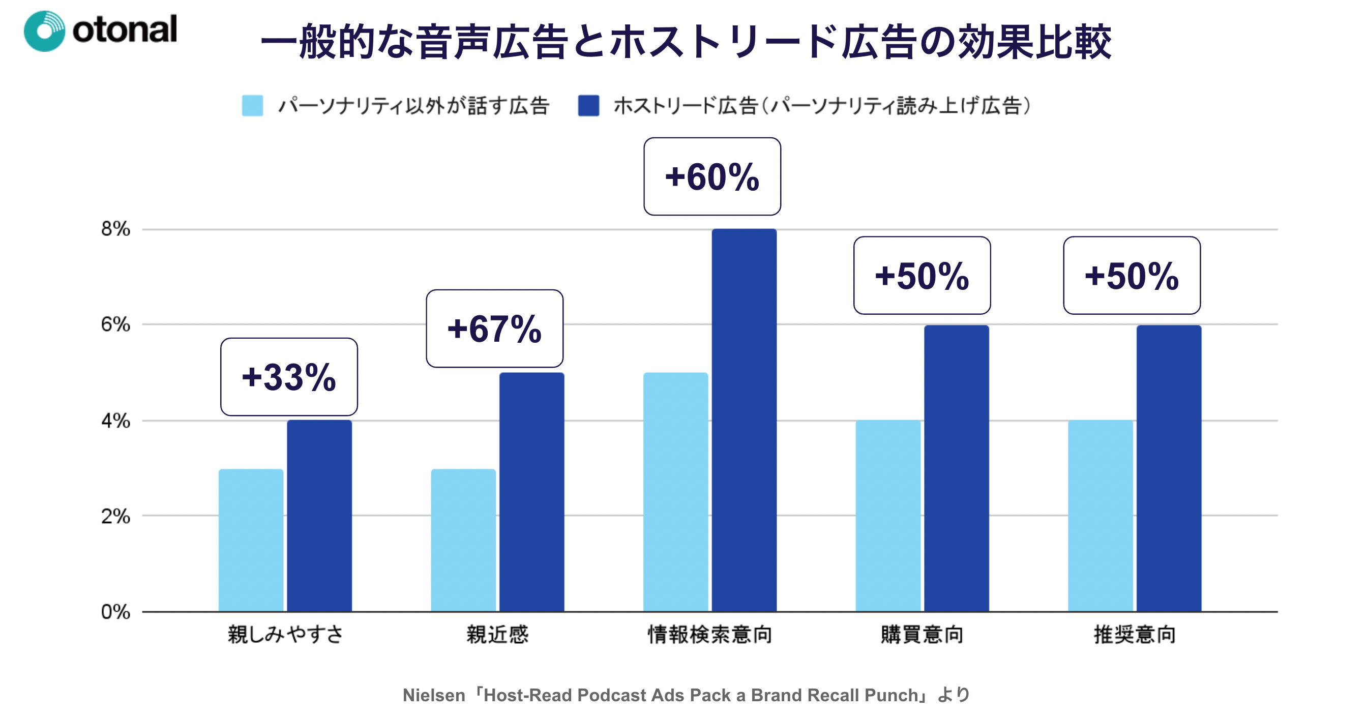 米国の調査会社ニールセンの調査(*4)では、ホストリード広告は、アナウンサーなどによるホストリードではない音声広告と比較して、購買意向などの広告効果が平均で50%以上高くなることが調査結果として示されています。