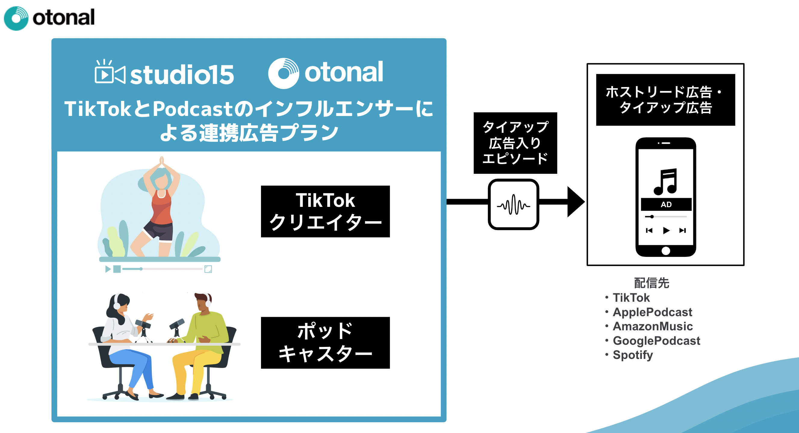この度、オトナルはstudio15と連携し、「TikTokクリエイター×ポッドキャスター広告」の提供を開始します。これによって、TikTokクリエイターとポッドキャスターのそれぞれのフォロワーに対して、拡散力と理解促進・共感を両立するインフルエンサーマーケティングの実現が可能になります。