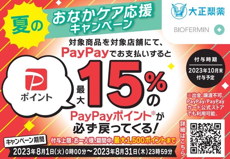 ビオフェルミン製薬は、親会社である大正製薬と下記の対象期間中、ビオフェルミンシリーズ及び大正漢方胃腸薬をキャンペーン対象店舗にて「PayPay」で購入すると、購入金額の最大15%のPayPayポイント(※)を付与する合同キャンペーンを実施します。