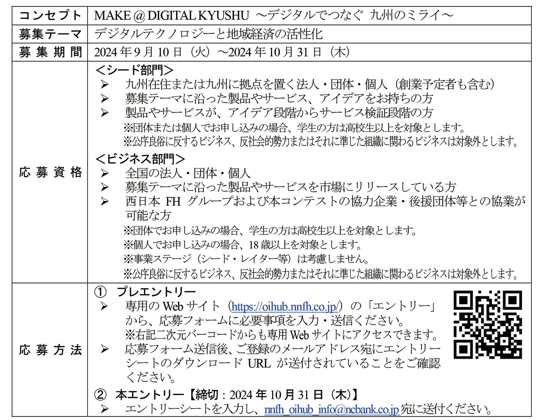 本コンテストは、西日本FHグループや協力企業・後援団体等との協業機会を創出し、地域経済の活性化や地域経済の課題解決に繋がるビジネスモデルの創出を目指すオープンイノベーション型のビジネス・アイデアコンテストです。5回目となる今回は、デジタル技術を活用した地域課題解決の促進を目的に「MAKE @ DIGITAL KYUSHU~デジタルでつなぐ 九州のミライ~」をコンセプトとし、サービスがアイデア段階からサービス検証段階で九州在住または九州に拠点を置く法人・個人等から募集する「シード部門」、既にサービスをリリースしている全国の法人・個人等から募集する「ビジネス部門」の2部門で開催します。本コンテストを通じて多くのアイデアの実現、製品・サービスの共同開発、販路開拓等のビジネス拡大につながるよう、たくさんのご応募をお待ちしております。