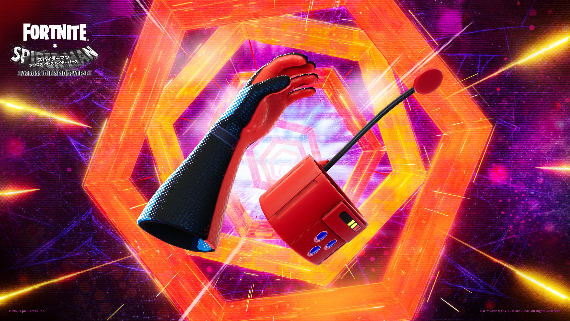 スパイダーマンのウェブシューターがフォートナイト バトルロイヤルに復活し、アイテムショップに新しいコスチュームが登場いたします。今度のウェブシューターは外見がマイルス・モラレス仕様の「スパイダーバース・ウェブシューター」。また、クエストをクリアすると、映画『スパイダーマン:アクロス・ザ・スパイダーバース』の楽曲を収録したロビートラックがアンロックされます。
