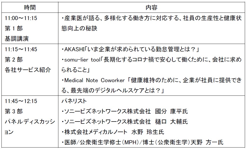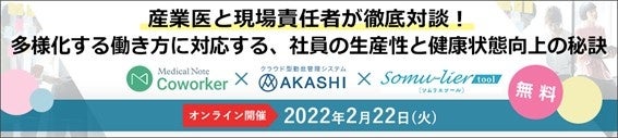 また、勤怠管理システム「AKASHI」や、社員のコンディション見える化ツール「somu-lier tool」、社員の健康維持を担うデジタルヘルスケア「Medical Note Coworker」もご紹介します。