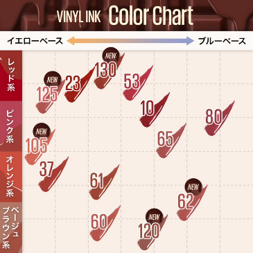 今回ヴィニルインクのラインナップに加わるのは、寒くなる季節に使いたくなるチョコレートカラーの5色です。ヌードカラーから深いレッドブラウンまで、肌に溶け込みながらツヤと柔らかさを演出します。既存のカラーと同様に、ご使用前に振っていただくことで2層構造になっている膜形成成分*1 と高濃度ピグメント*2 が混ざり合い、食べても飲んでも塗りたての仕上がりを一日中*3 楽しんでいただけます。
