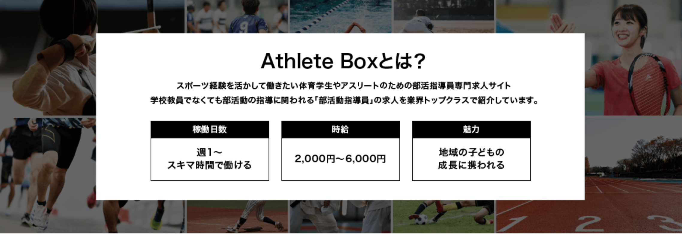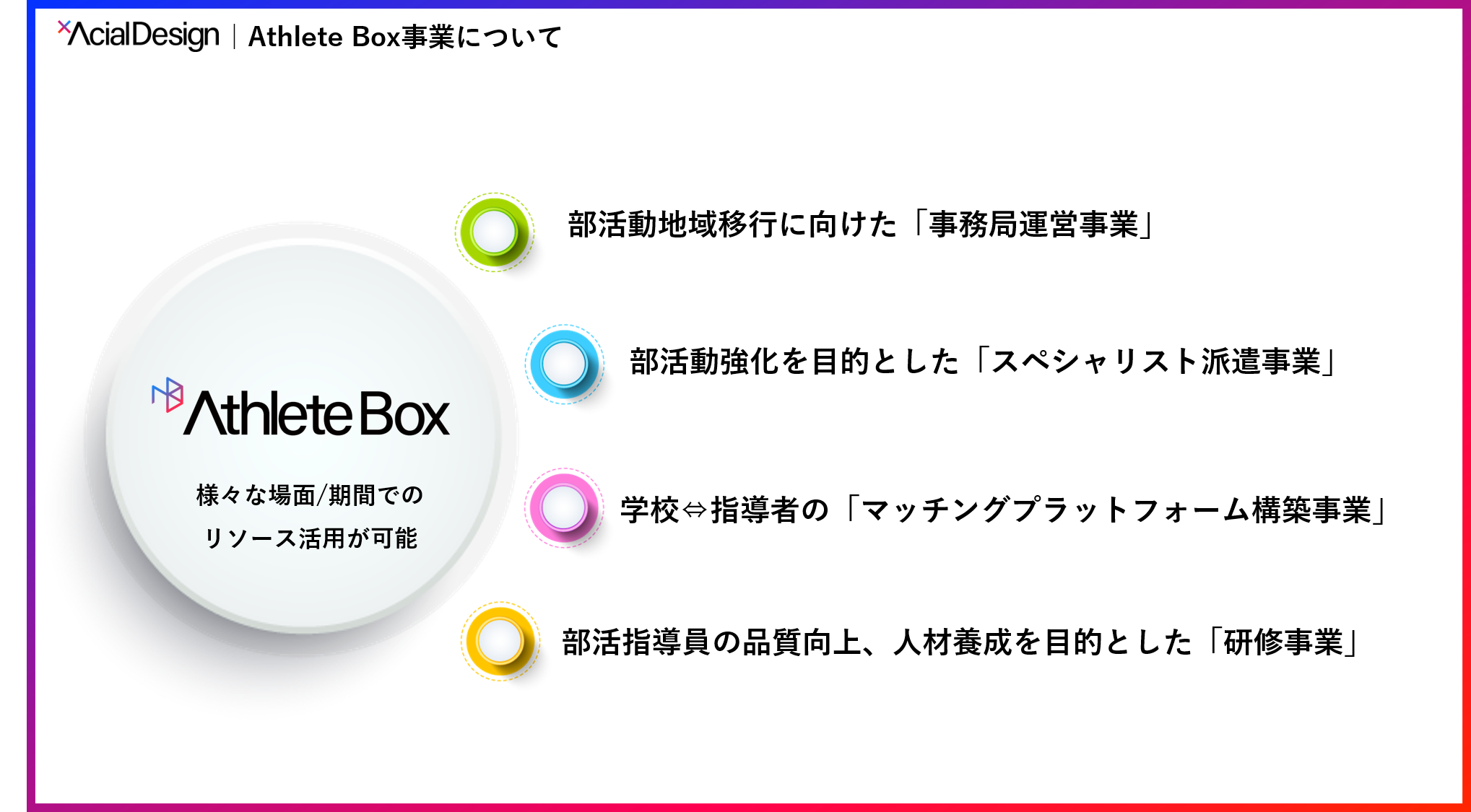 創業以来からアスリートや体育会人材に向けてのキャリア支援をしてきたアーシャルデザインでは、これまで構築してきた人材ネットワークを活かして、各自治体や学校様へスポーツ人材を活用した「部活指導員」の派遣を行い課題解決を行なっていく事業「Athlete Box」を立ち上げました。