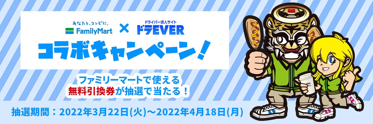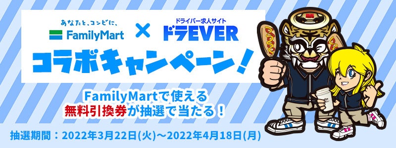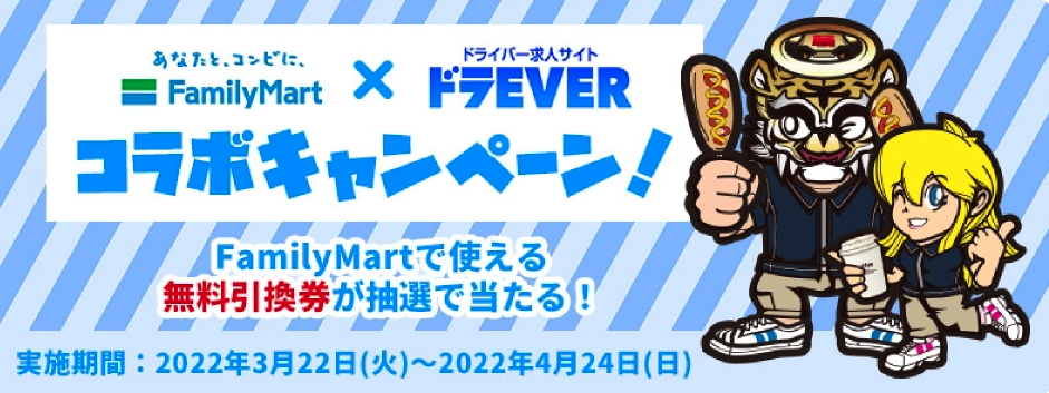 株式会社ドラEVER(本社:東京都港区、代表取締役:加藤智江)は、日々私たちの生活の基盤を支えているドライバー職の存在を世間の方により良く知っていただき、運送業界の発展、繁栄に貢献するため、また、普段ドラEVERを愛用してくれているドライバーの皆さまに感謝を込めて、「ドラEVERに新規登録またはログインしファミリーマートで使える無料引換券をプレゼントキャンペーン」を実施いたします。