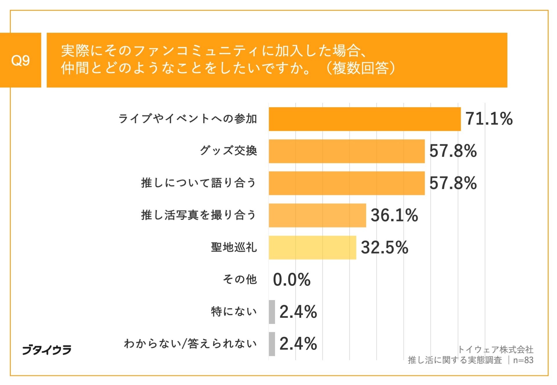 Q8で「非常に興味がある」「やや興味がある」と回答した方に、「Q9.実際にそのファンコミュニティに加入した場合、仲間とどのようなことをしたいですか。(複数回答)」(n=83)と質問したところ、「ライブやイベントへの参加」が71.1%、「グッズ交換」が57.8%、「推しについて語り合う」が57.8%という回答となりました。