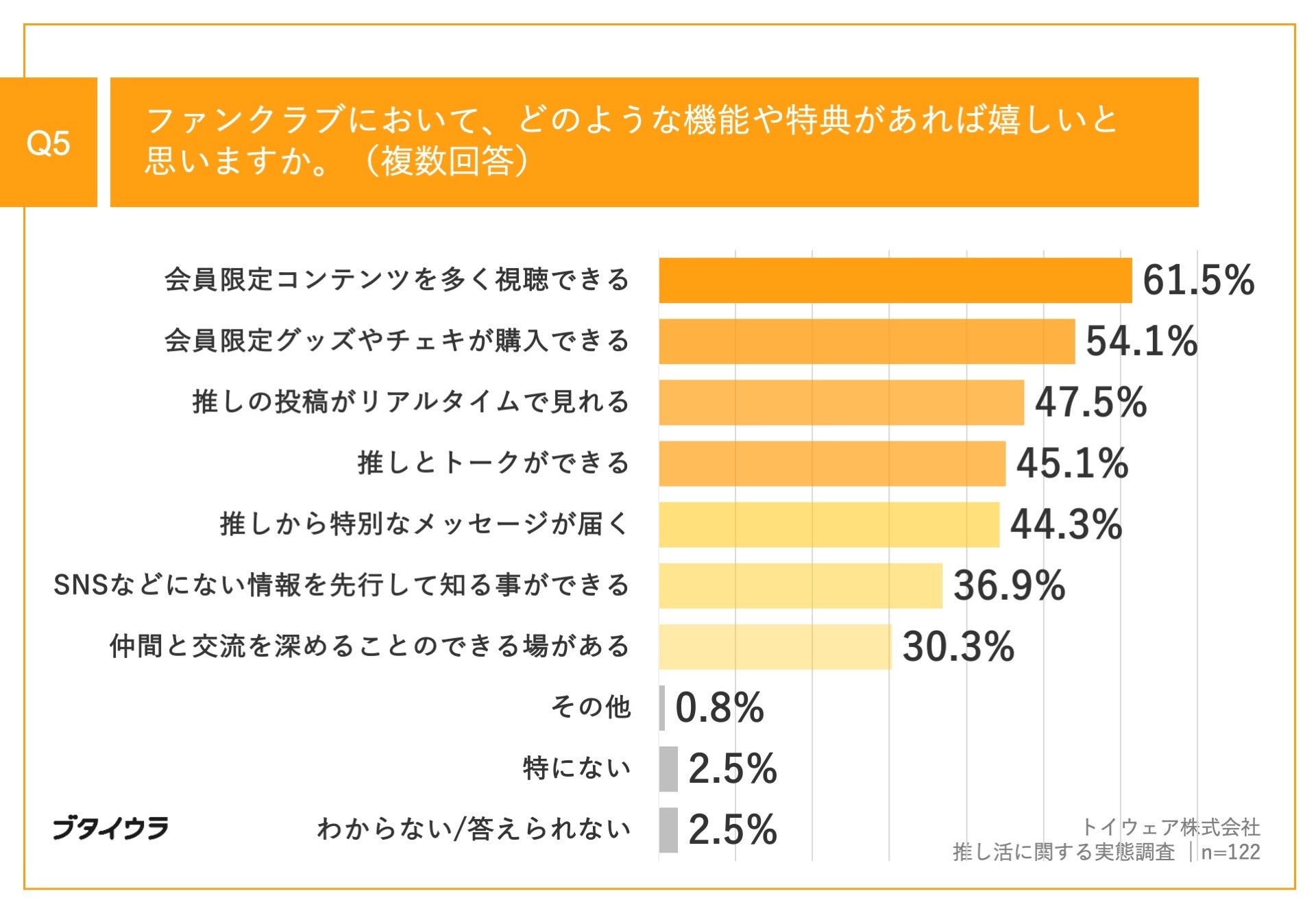 「Q5.ファンクラブにおいて、どのような機能や特典があれば嬉しいと思いますか。(複数回答)」(n=122)と質問したところ、「会員限定コンテンツを多く視聴できる」が61.5%、「会員限定グッズやチェキが購入できる」が54.1%、「推しの投稿がリアルタイムで見れる」が47.5%という回答となりました。