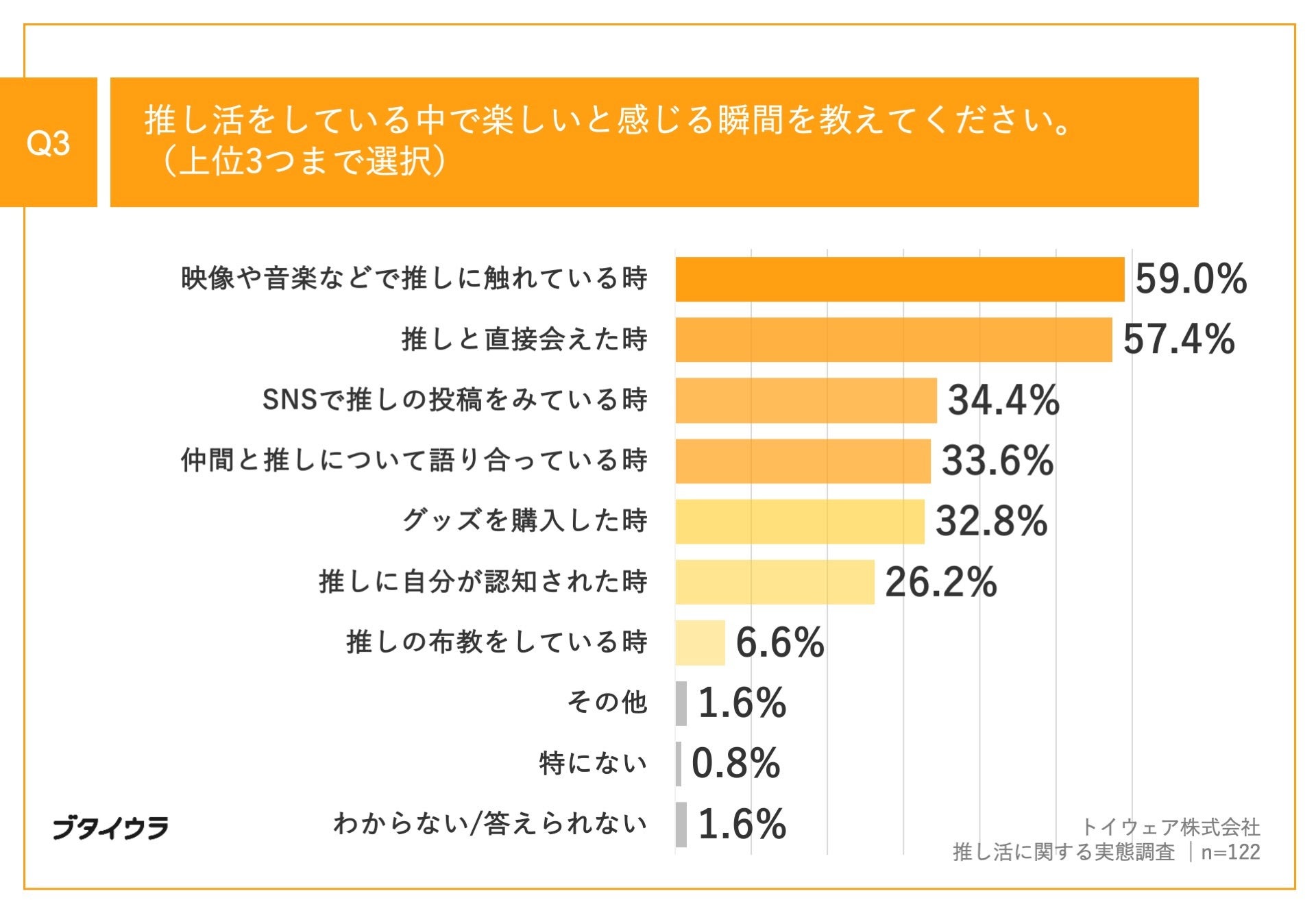 「Q3.推し活をしている中で楽しいと感じる瞬間を教えてください。(上位3つまで選択)」(n=122)と質問したところ、「映像や音楽などで推しに触れている時」が59.0%、「推しと直接会えた時」が57.4%、「SNSで推しの投稿をみている時」が34.4%という回答となりました。