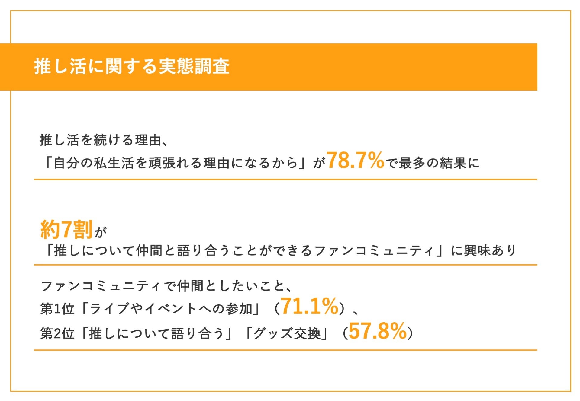 【推しに3年間「熱狂」し続けるワケとは?】「自分の私生活を頑張れる理由になるから」が最多に 約7割が「ファンコミュニティ」に興味あり