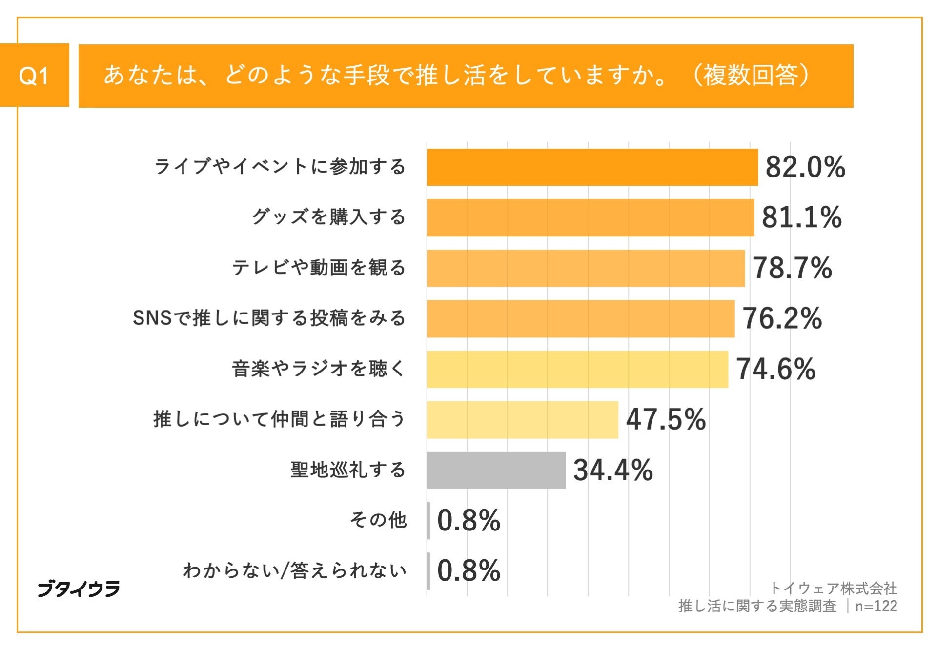 「Q1.あなたは、どのような手段で推し活をしていますか。(複数回答)」(n=122)と質問したところ、「ライブやイベントに参加する」が82.0%、「グッズを購入する」が81.1%、「テレビや動画を観る」が78.7%という回答となりました。