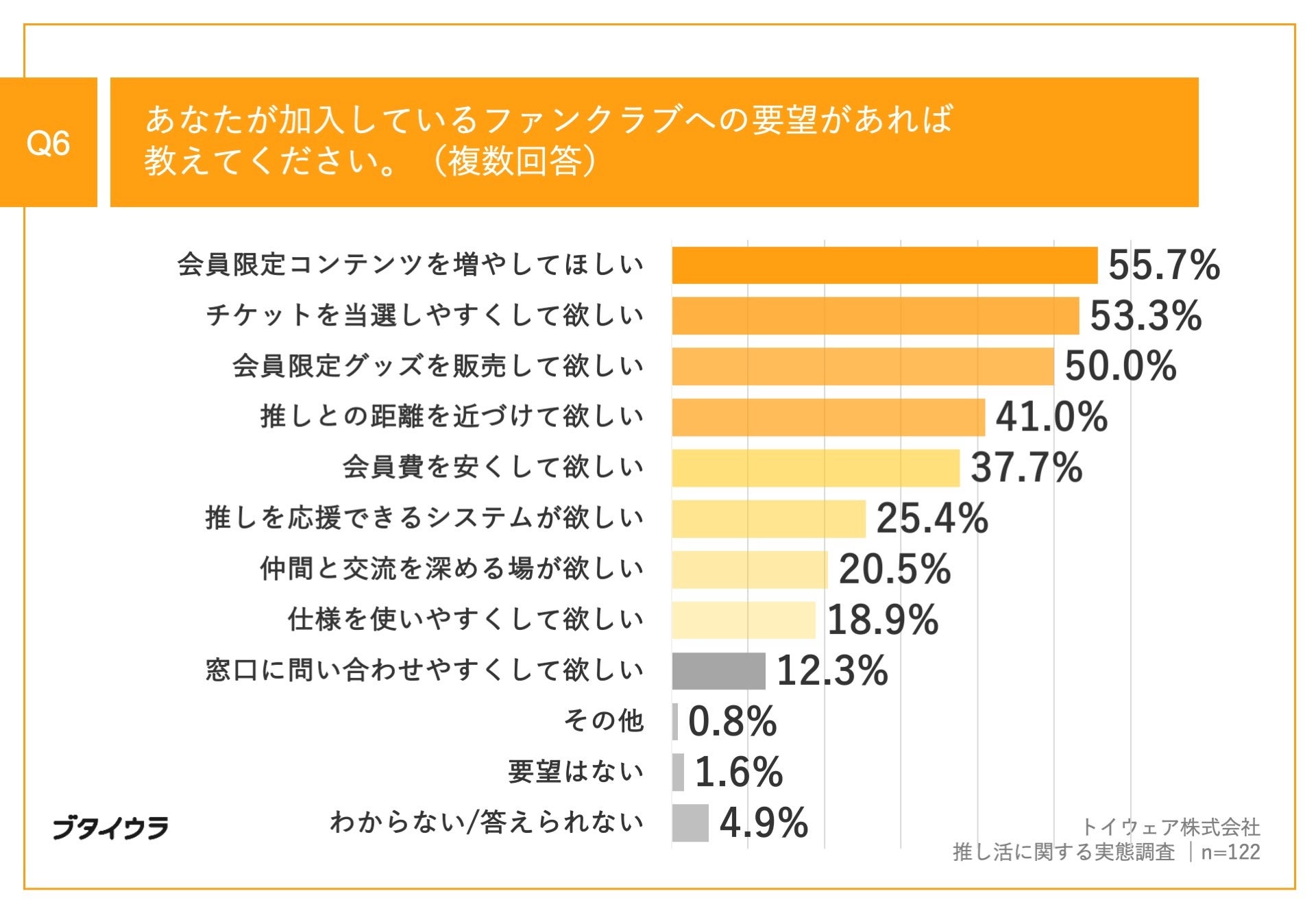 「Q6.あなたが加入しているファンクラブへの要望があれば教えてください。(複数回答)」(n=122)と質問したところ、「会員限定コンテンツを増やしてほしい」が55.7%、「チケットを当選しやすくして欲しい」が53.3%、「会員限定グッズを販売して欲しい」が50.0%という回答となりました。