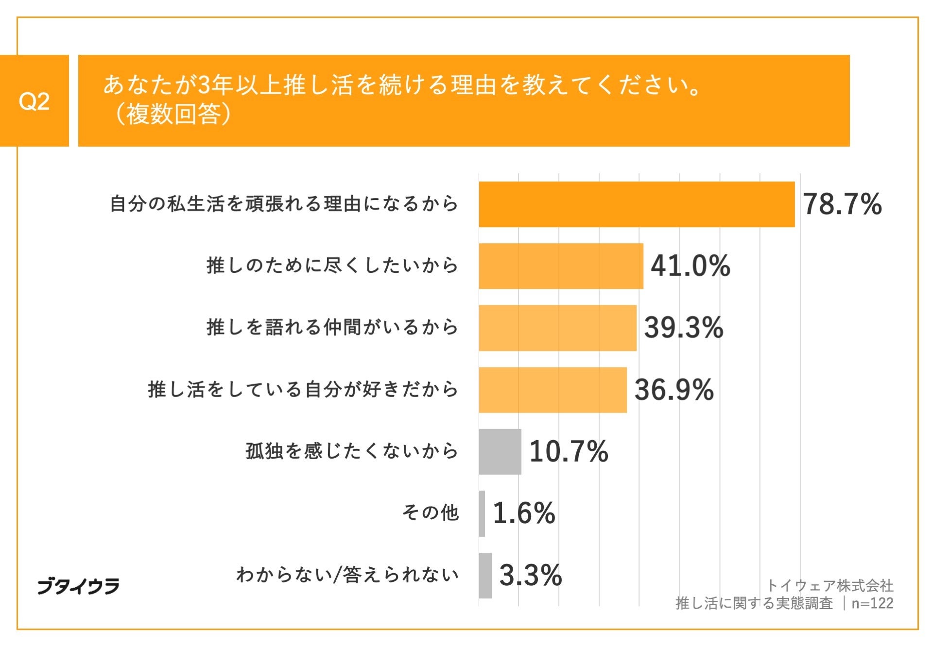 「Q2.あなたが3年以上推し活を続ける理由を教えてください。(複数回答)」(n=122)と質問したところ、「自分の私生活を頑張れる理由になるから」が78.7%、「推しのために尽くしたいから」が41.0%、「推しを語れる仲間がいるから」が39.3%という回答となりました。