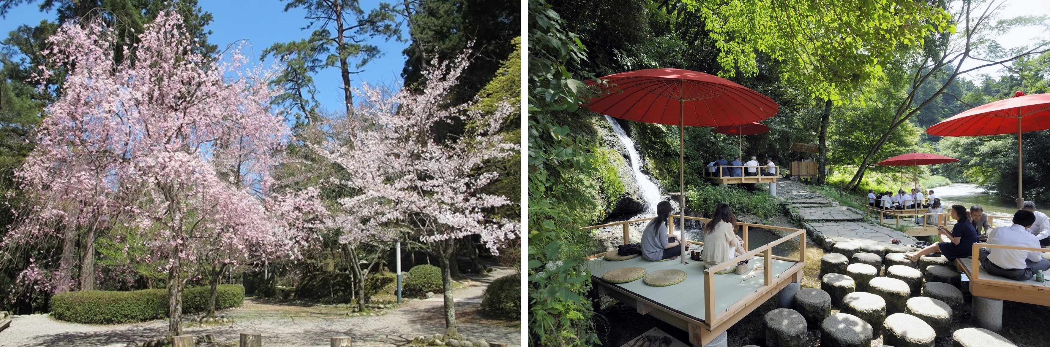 あやとり橋や桜公園のほど近く、遊歩道沿いの憩いの場として人気の「川床」。渓谷の深い緑や清らかな水の流れ、この地に生息する野鳥のさえずりなどを楽しむことができます。また、川床でしか味わうことのできない、山中出身の“和の鉄人”道場六三郎氏監修の特別な甘味もみどころです。