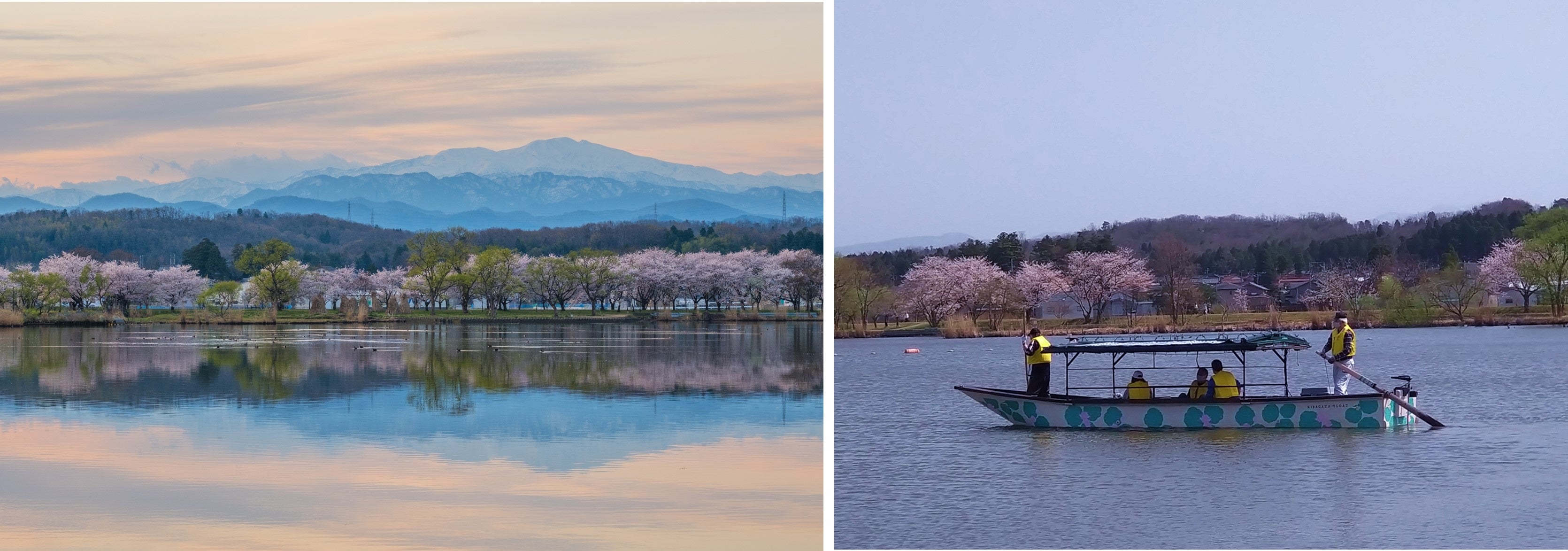 白山や田園の風景と調和した木場潟を自然のまま残した水郷公園です。木場潟を周遊できる「周遊園路」は「美しい日本の歩きたくなる道」500選のひとつに選ばれており、約1,700本の桜並木が続きます。「木場潟」「桜」「白山」が共演する絶景を求めて、毎年多くの観光客が訪れます。