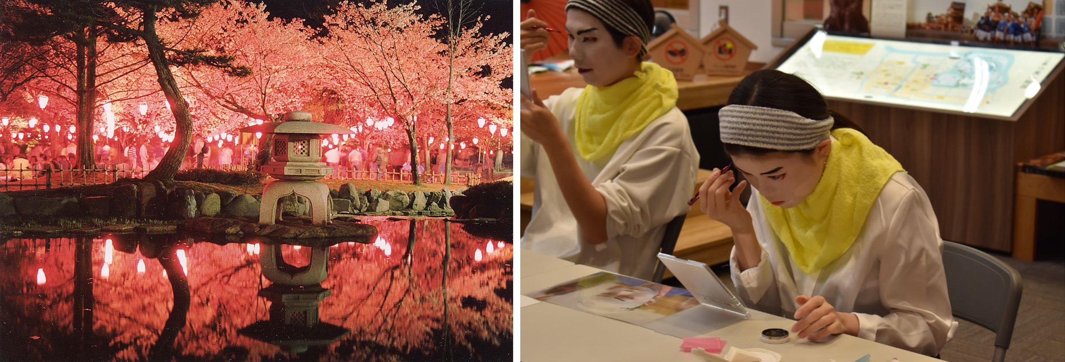 小松駅西地区は、町衆文化の代表「曳山子供歌舞伎」をはじめとして、町家、寺社、九谷焼など先人から受け継いだ地域資源が集積しており、その拠点である「こまつ曳山交流館みよっさ」では様々な和文化を体験できます。自身で化粧をし、衣裳を着て歌舞伎役者になりきることもできます。