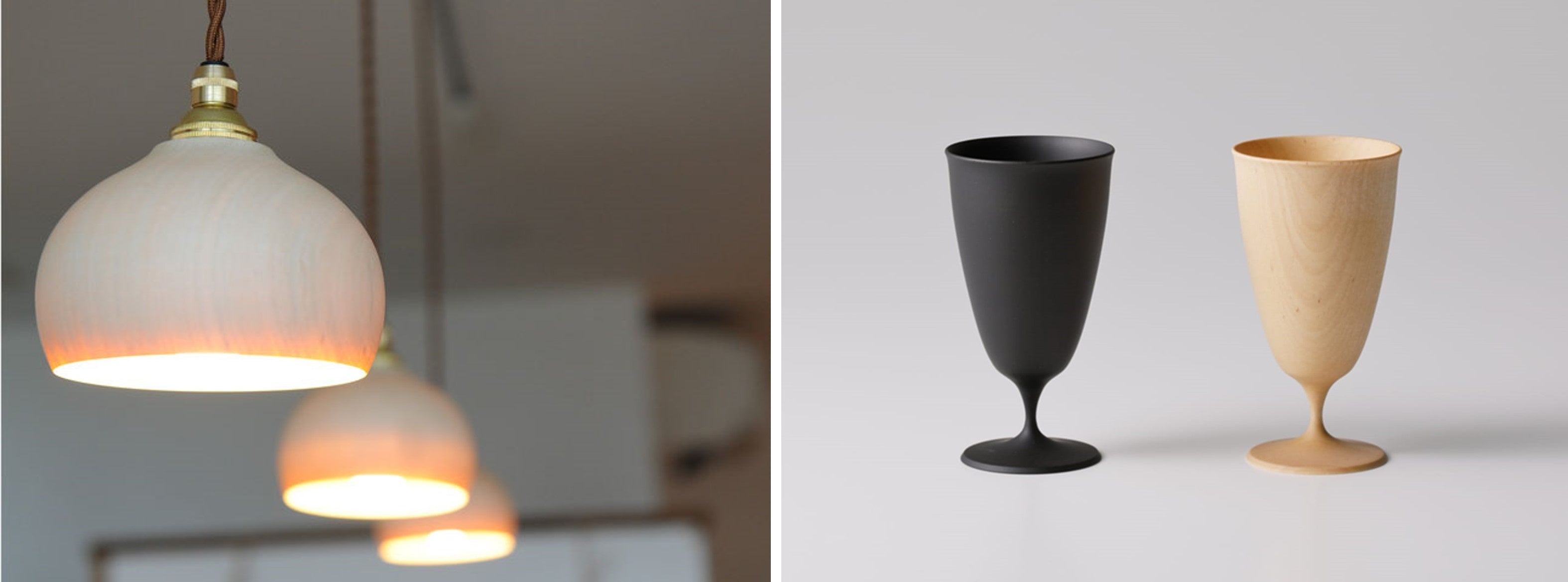 山中温泉街のよりずっと山の奥にある白鷺木工は、3世代に渡り山中漆器を中心に丸物木地を作り続けています。原木の加工から携わる数少ない職人で、原木の木取りから仕上げ挽きまで一貫して手掛けることで、木の風合いを生かした温かみのある作品が生まれます。栃の木で作ったランプシェードは、形はお椀と同じですが、お椀よりもずっと薄く挽くことで透ける光はとてもやさしく空間を包みます。